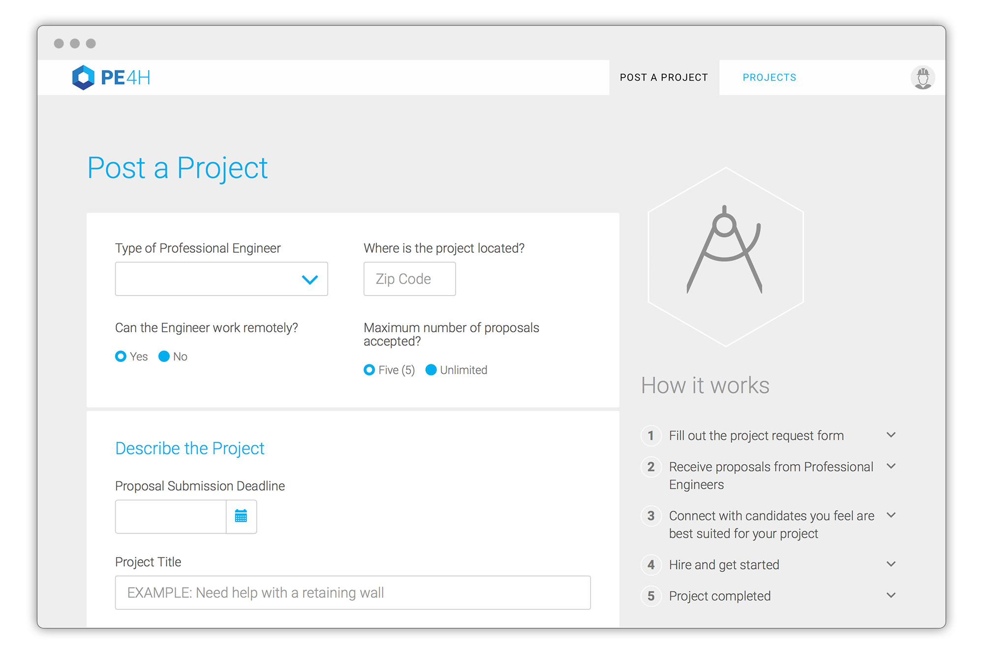 We collaborated with PE4H to build their marketplace, where users can post a project and receive proposals from a pool of licensed professional engineers.